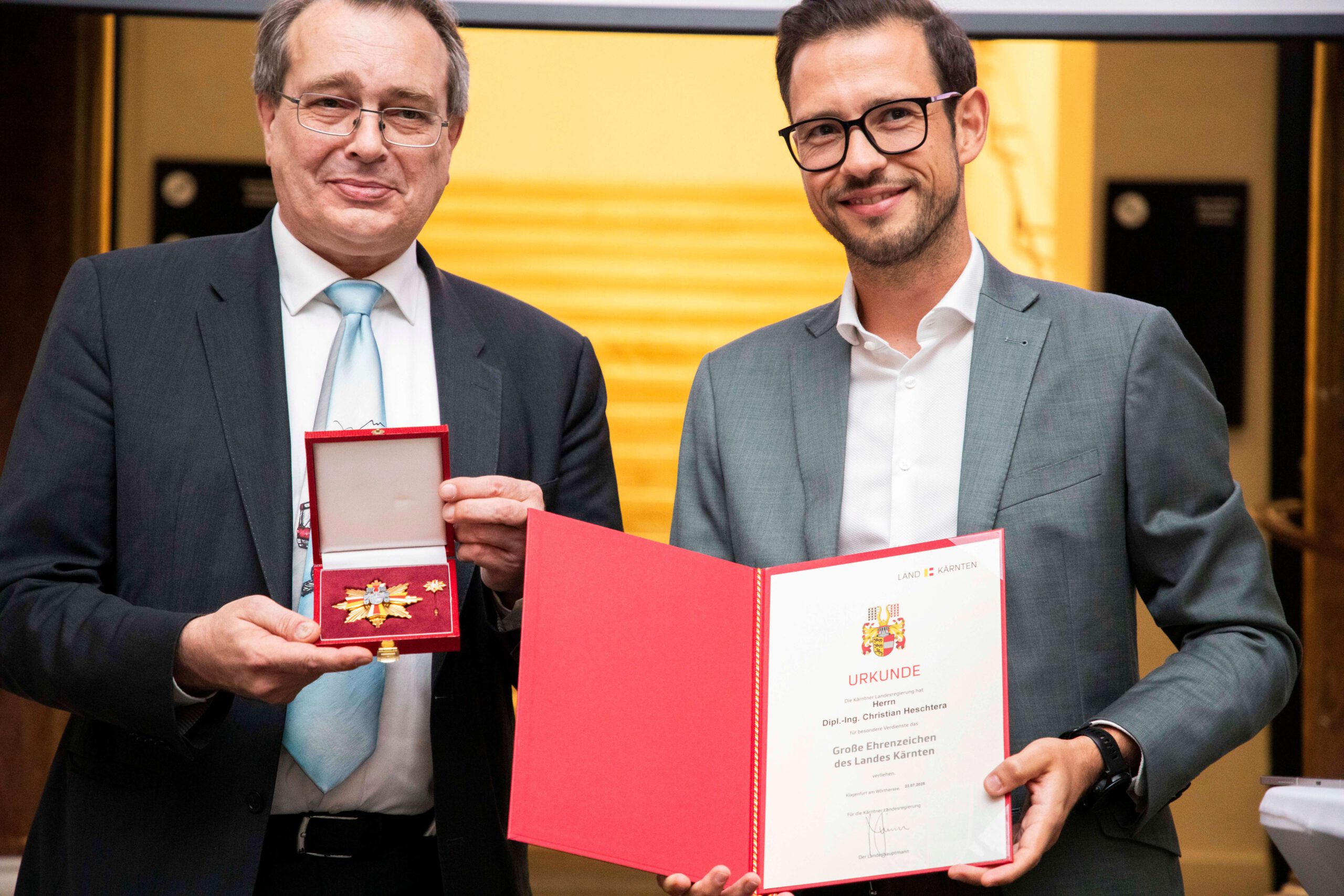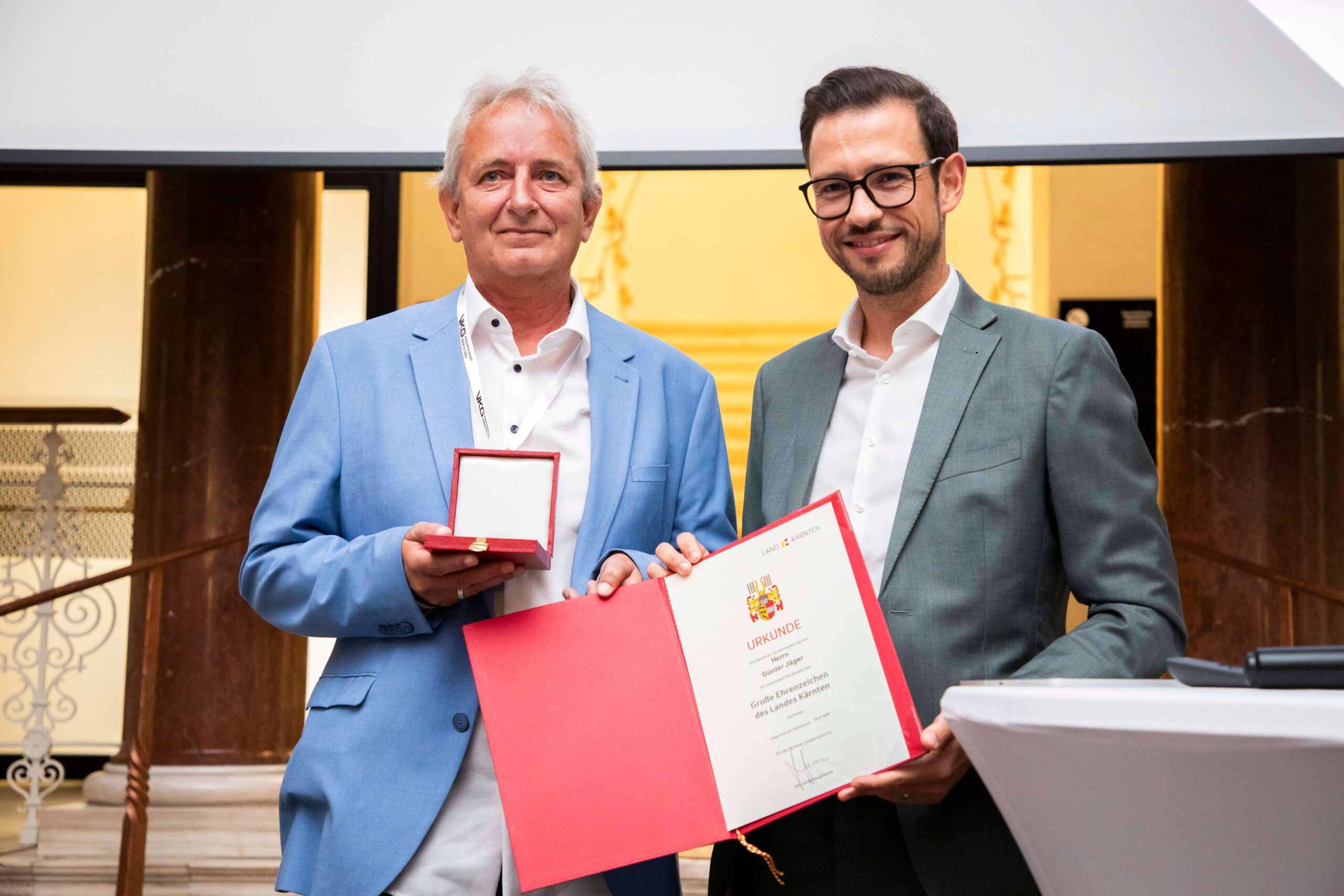 Ein besonderer Moment war die Verleihung des Großen Goldenen Ehrenzeichens des Landes Kärnten: Landesrat Mag. Sebastian Schuschnig überreichte die Auszeichnung an den Geschäftsführer der VKG, DI Christian Heschtera, sowie an den langjährigen Prokuristen Günter Jäger – als Anerkennung für ihren maßgeblichen Beitrag zur Entwicklung und Stärkung des Öffentlichen Verkehrs seit der Gründung des Verkehrsverbunds im Jahr 2000.